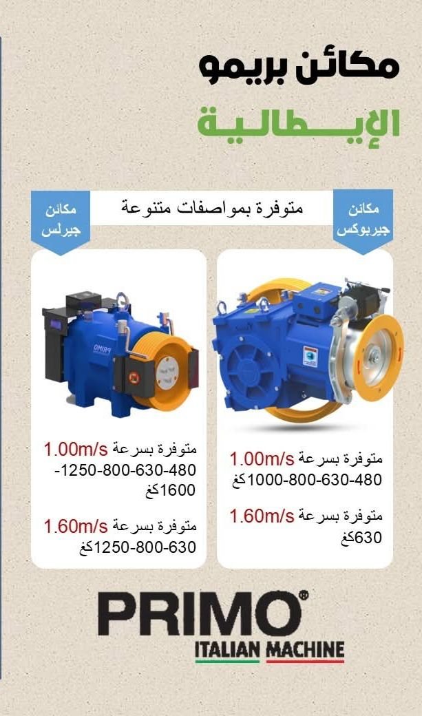 تُعد ماكينة بريمو الإيطالية (Primo) من الحلول الرائدة والموثوقة في عالم محركات المصاعد، حيث تجمع بين دقة التصنيع الإيطالية والكفاءة العالية في الأداء. صممت هذه المحركات لتوفر تجربة نقل عمودي سلسة وآمنة، مع خيارات متنوعة تناسب مختلف أنواع المباني والحمولات.